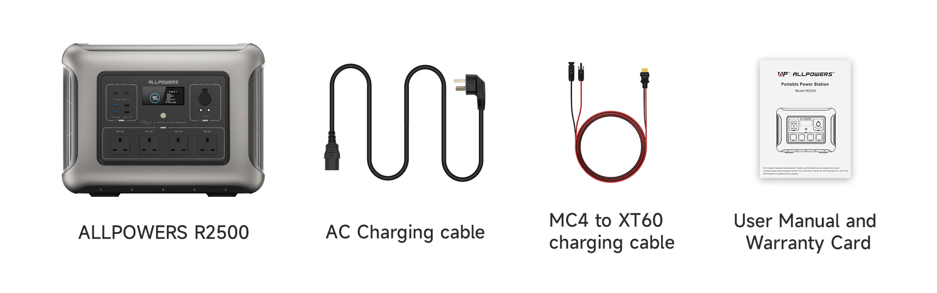 【Warranty & Scope of Delivery】ALLPOWERS R2500 offers you 6 years warranty and friendly customer service. Package Included: 1* ALLPOWERS R2500 Portable Power Station, 1* AC Charging Cable, 1* Multi-Contact 4 to XT60 Charging Cable, 1* User Manual.