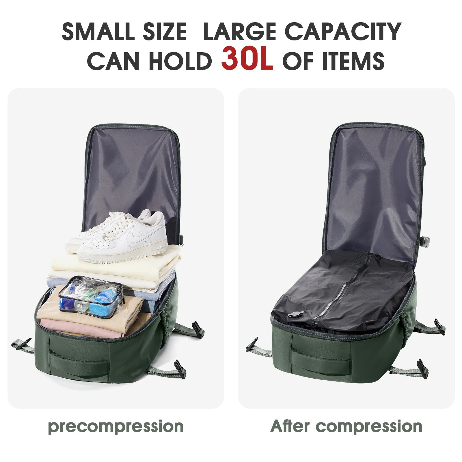 📦 Expandable 30L capacity with vacuum compression for max space
